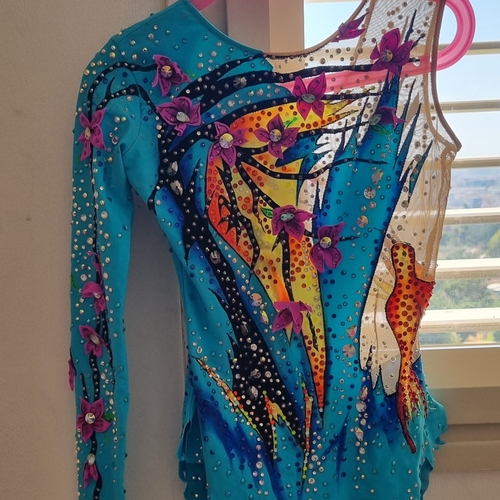 בגד גוף שרוול אחד בגוון טורקיז בולט. מרשים ומיוחד עם אפליקציית פרחים. נשמר בקפדנות. יש מעט גמישות במחיר. מאור יהודה או חולון 0542606745